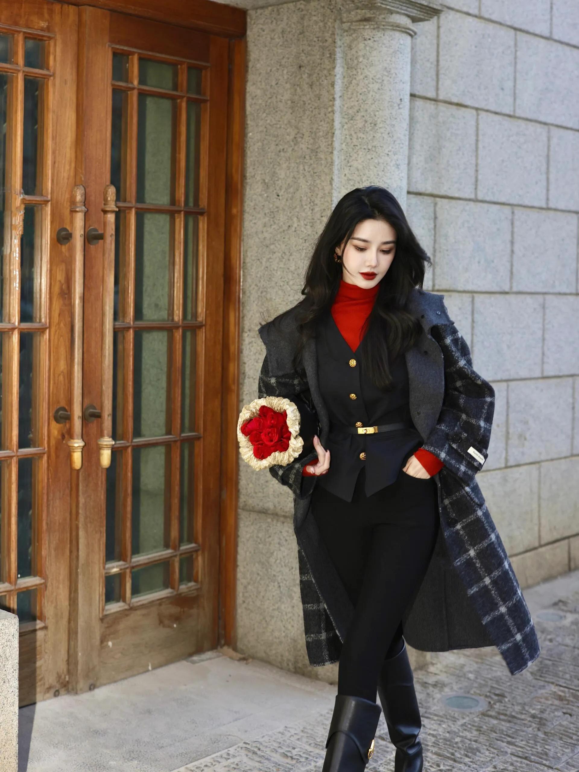 像上面这位时尚达人,用格纹的灰色大衣内搭西服,叠穿红色毛衣,加上黑色无痕裤,这时候自然要选择黑色的中筒靴来组合更容易延伸腿部线条。