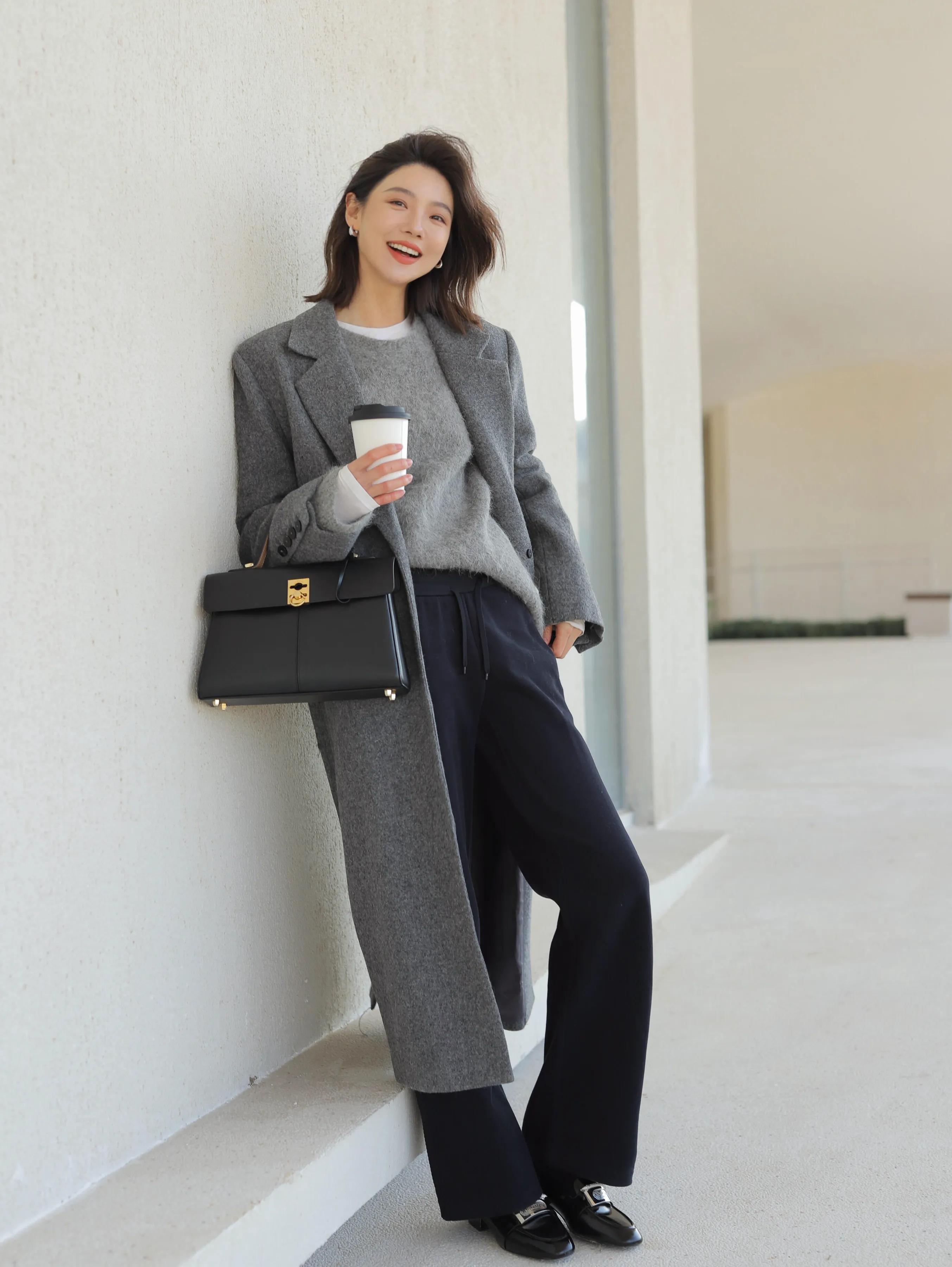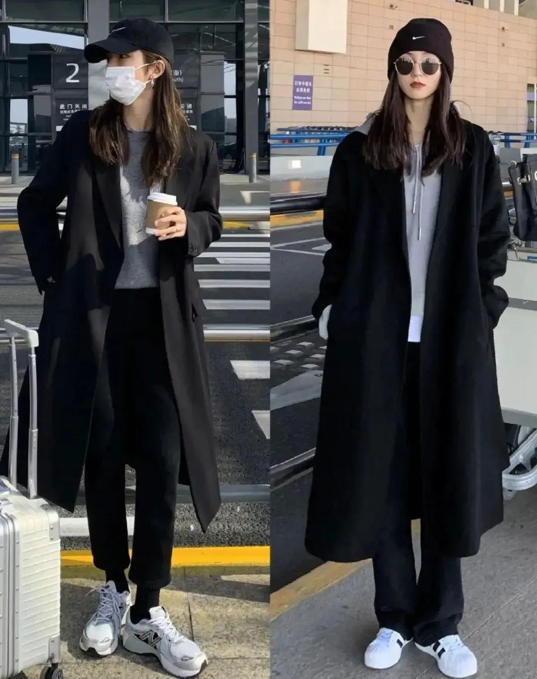 例如,上面这位时尚达人,就用黑色大衣内搭灰色针织毛衣或者是卫衣,和一条黑色的直筒长裤组合,脚穿老爹鞋小板鞋就能轻松 get 到时尚感。