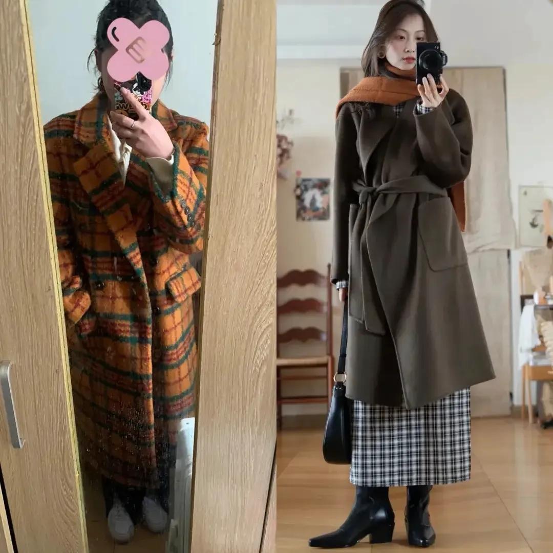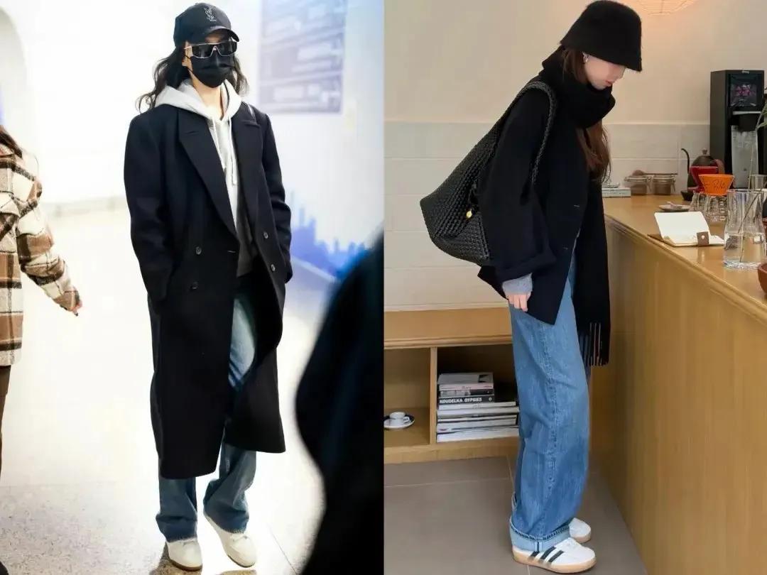 我们的穿衣造型有的时候确实需要添加一些亮色的配色。例如上面左边这一套穿搭,用的就是灰色大衣搭配小牛仔微喇叭长裤,内搭的衣服是白色毛衣和衬衫进行叠穿,层次感已经很好了,