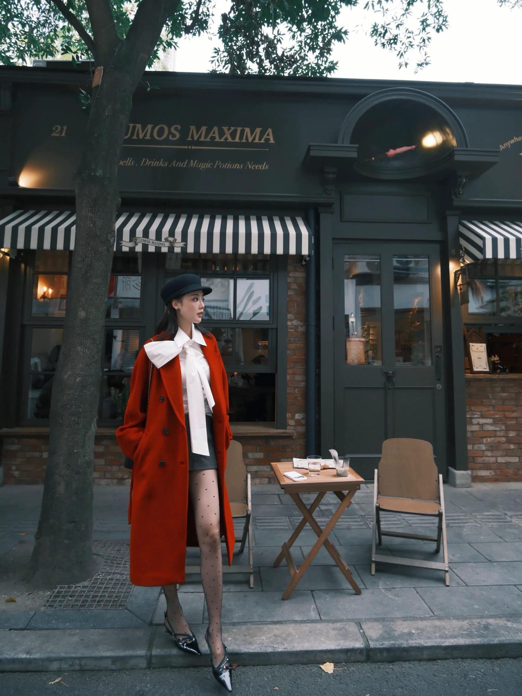 在这个寒冷的冬天,喜欢拍照的你,推荐你选择一件红色大衣。红色大衣裹挟着明艳的气场,就像冬日里最热烈的火,下半身选择用黑色的短裙来组合,利落中藏着几分妩媚。最抢眼的莫过于内搭的黑色波点丝袜,细碎的波点在光影里跳跃,复古又俏皮,将整体气质的妩媚与风情完美呈现出来。