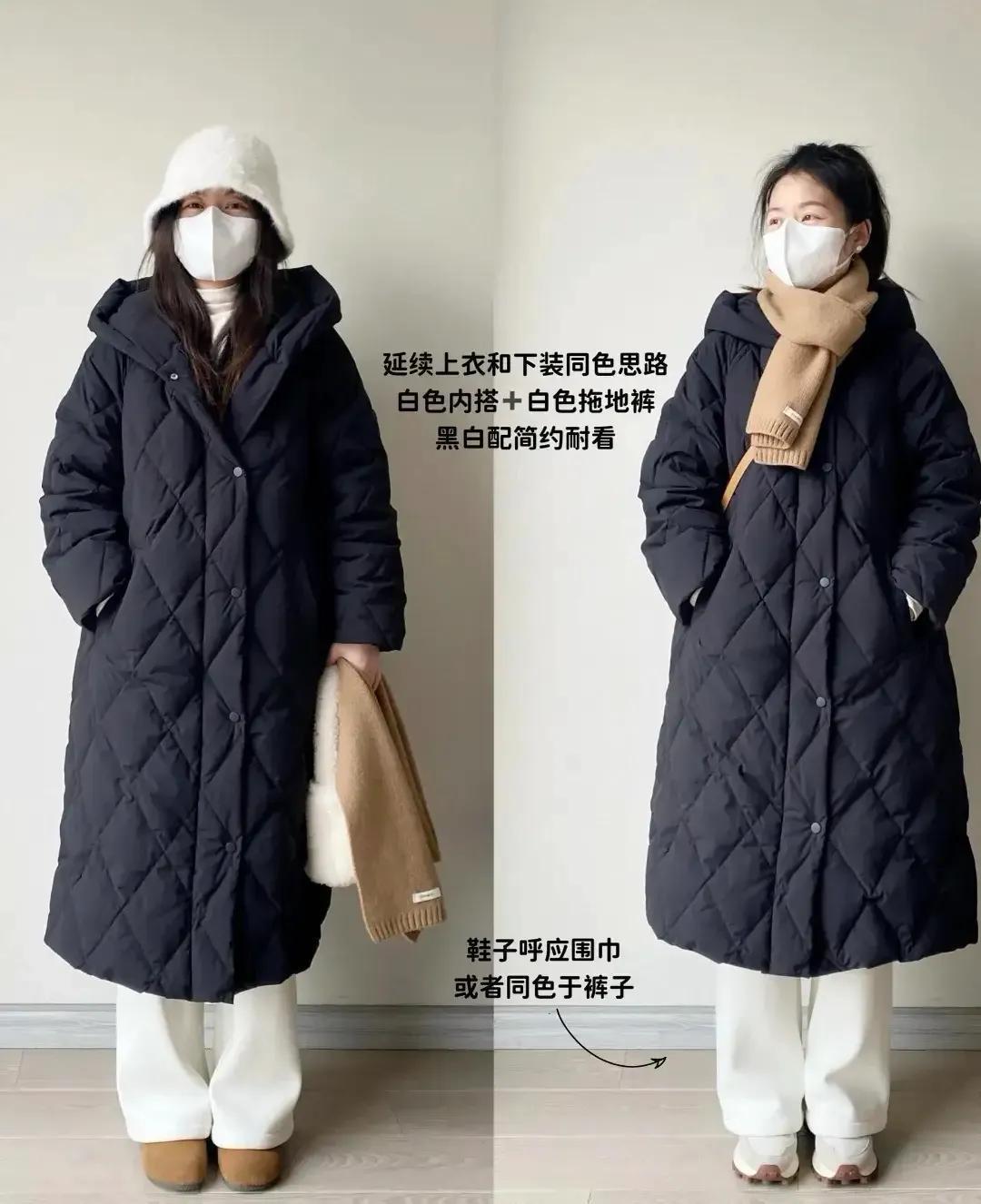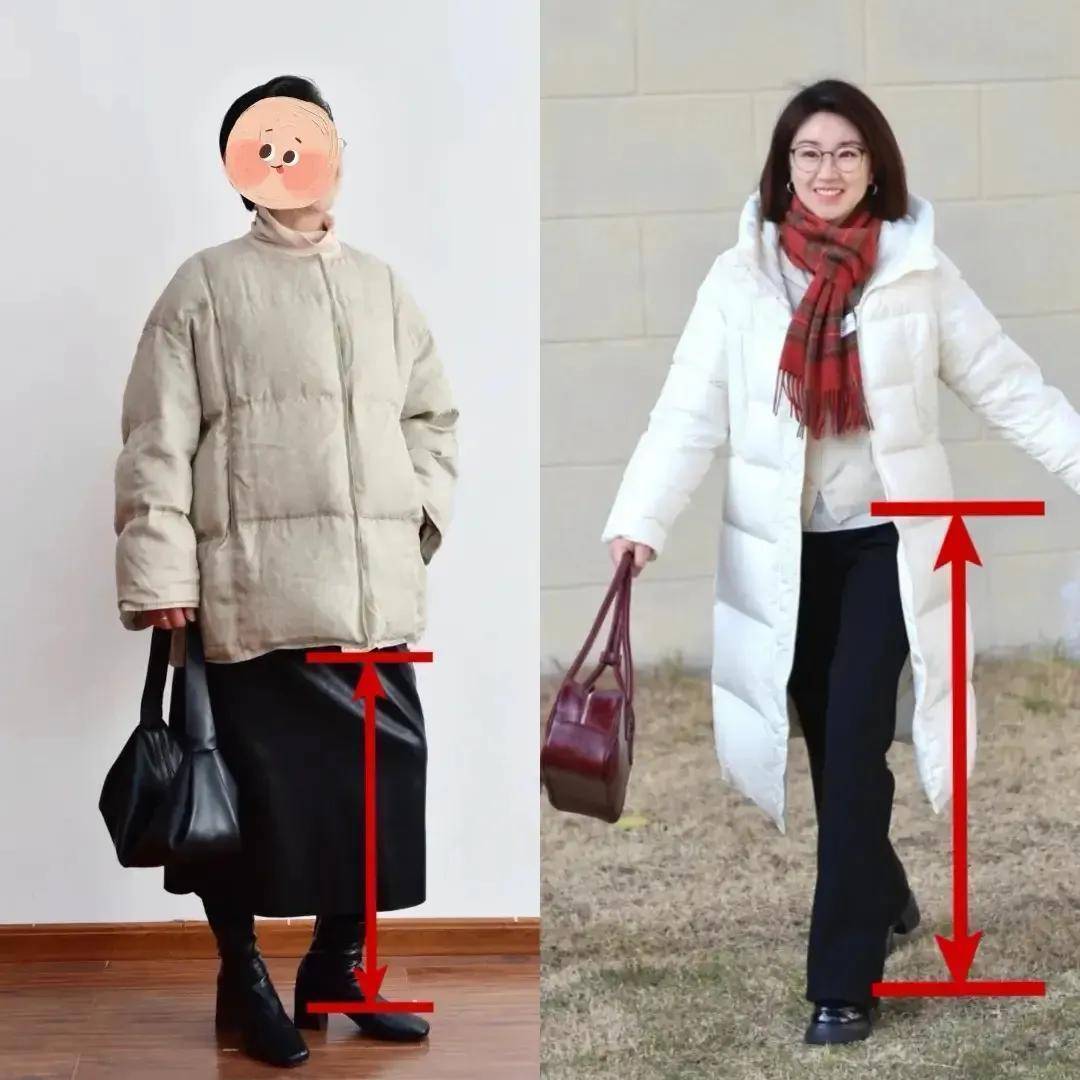 当你选择的羽绒服外套不短不长,还加上一条黑色的直筒半身裙,而且,两件衣服单品的色差很大,瞬间能看到腰线位置在哪里,这一件羽绒服就很容易压个子让人显矮还显胖。