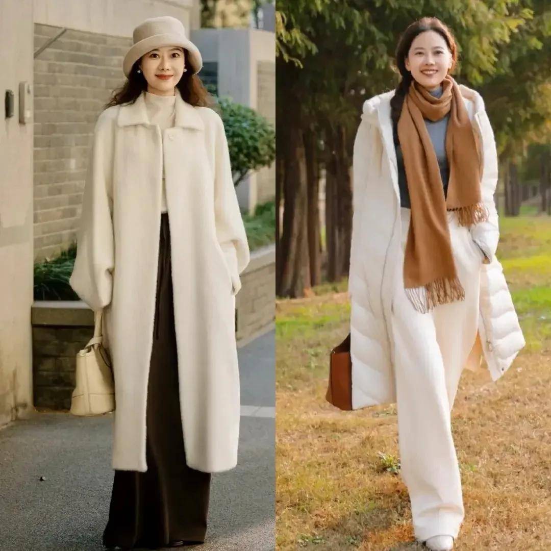 想让自己的造型变得更加精致时髦,我们可以选择最为基础的白色大衣内搭白色毛衣,加上一条直筒半身裙,或者换成长款的羽绒服,内搭灰色毛衣加上白色阔腿裤。